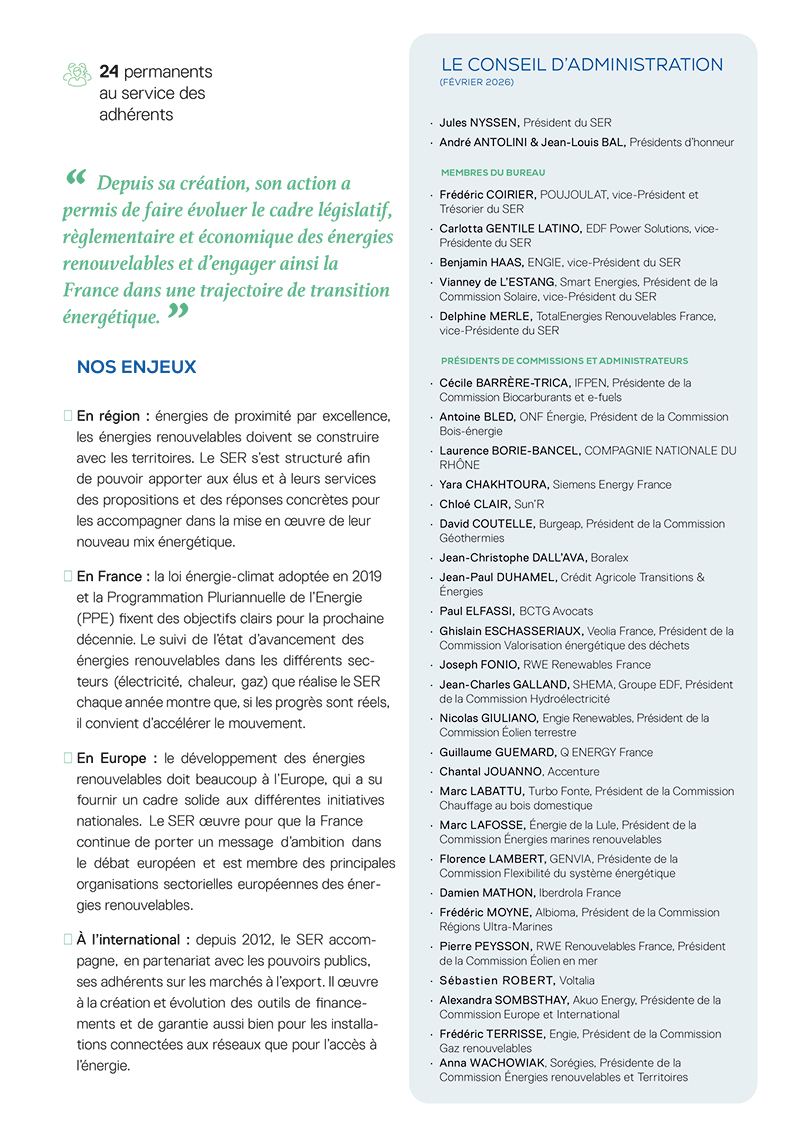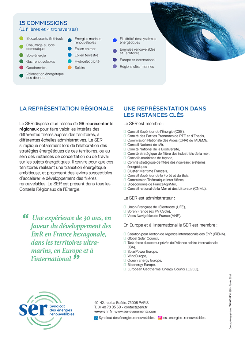 En choisissant de s’unir, les 400 adhérents du SER mettent en commun leurs moyens pour favoriser le développement de toutes les énergies renouvelables en France et à l’export.